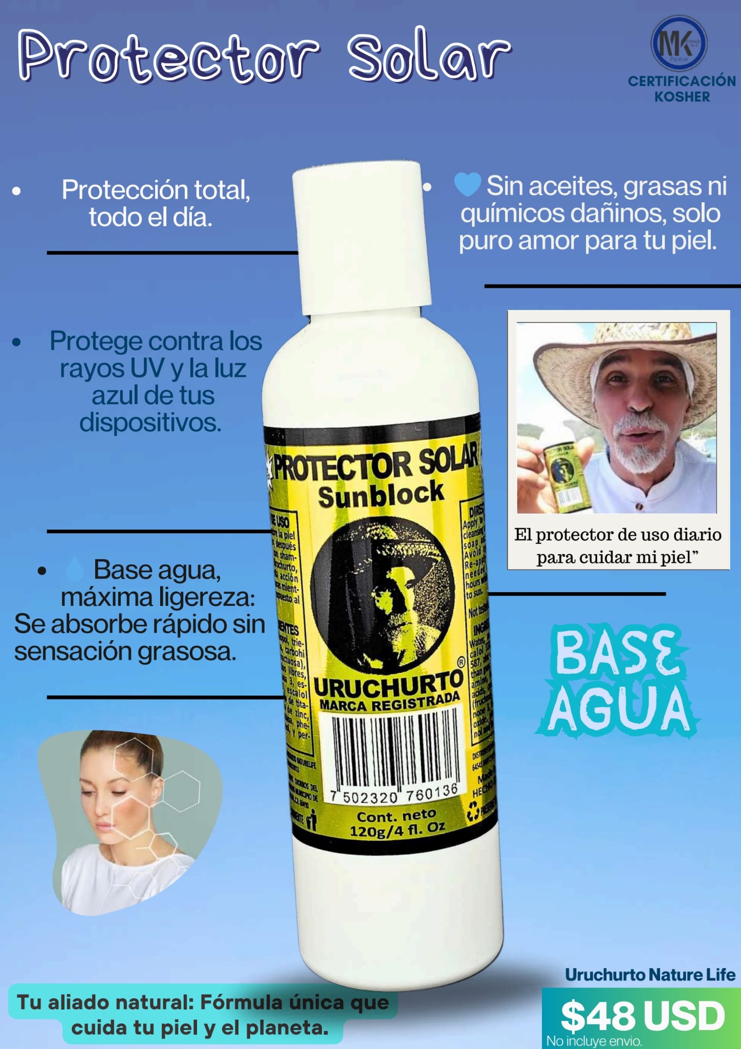 PROTECTOR SOLAR Sunblock Uruchurto es el mejor aliado para proteger tu piel. Con una fórmula única a base de agua y los mejores productos naturales, es el bloqueador solar más efectivo del mundo, elaborado cuidadosamente para brindarte beneficios inigualables. Disfruta del sol sin preocupaciones con Uruchurto.
